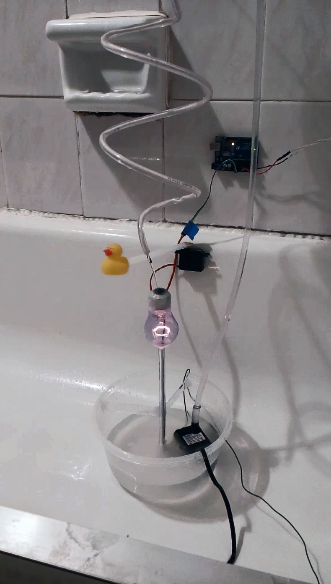 1. Arduino Uno 2. Rubber Ducky 3. Servo 4. Vinyl Tubing 5. Water Fountain Pump 6. Exposed 120 Volts 7. 40W 120V Light Bulb 8. Salted Water 9. String